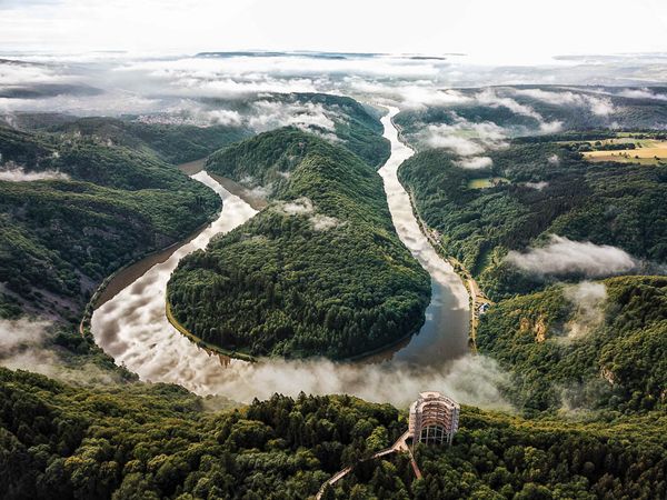 De etappe van vandaag ging normaalgezien door het romantische dal van de Steinbach. Het meditatie-resorthotel Neumühle heeft de doorgang langs hun terrein echter afgesloten voor wandelaars, waardoor er een omleiding in voege is. Momenteel is de toeristische dienst opnieuw met hen aan het onderhandelen. Hoe dan ook, het hoogtepunt van de dag is er gelukkig nog wel: het uitzichtpunt over de Saarschleife, waar de rivier de Saar diep onder je meandert. Wie geen hoogtevrees heeft, kan hier een unieke wandeling door de boomtoppen maken, tot een uitkijkplatform dat nog eens 40 meter hoger ligt (betalend, niet inbegrepen). Daarna is het afdalen, over spectaculaire paden, tot je in het dal je volgende logies bereikt in het aangename stadje Mettlach, op de oever van de Saar.