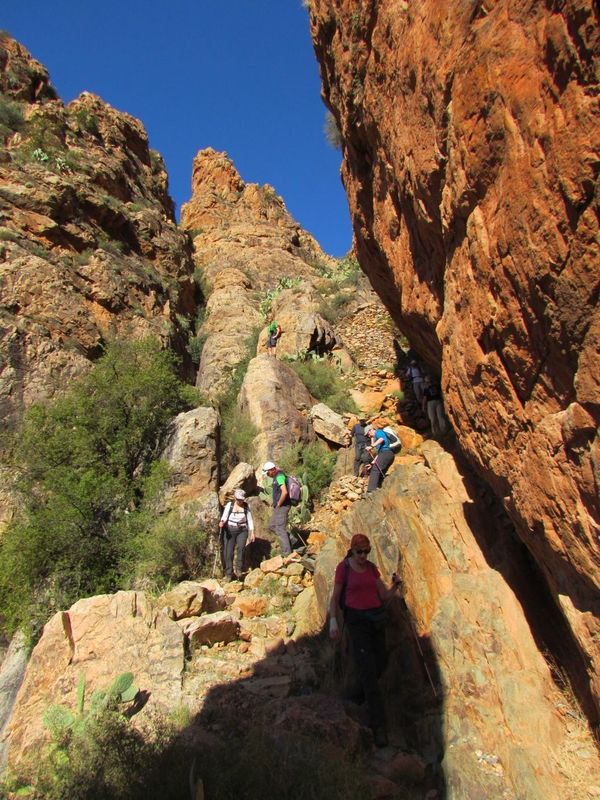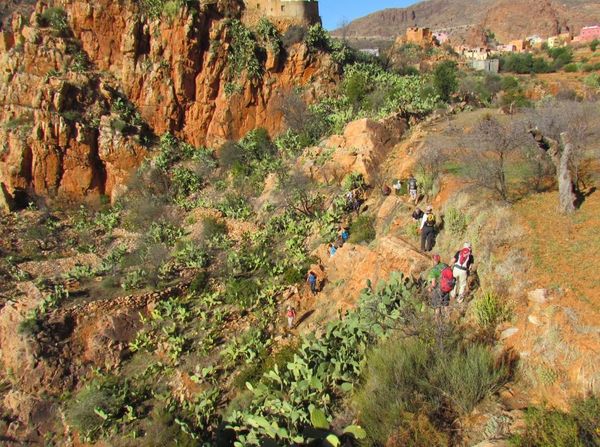 Vandaag wandel je eerst verder door de vallei. De rivier moet een paar keer worden overgestoken via een brug of een droge bedding. Regelmatig kruis je een ‘tegenligger’, een ezeldrijver met zijn ezel. Je kijkt regelmatig eens achterom om te genieten van het uitzicht over de prachtige vallei en gaat over de col Targa-n-Touchka (720 m). Na de picknick wordt het pad wat rotsig en nadien gaat het omhoog via een nauwe kloof met steile rotswanden. Je wandelt afwisselend door de rivierbedding en over een pad dat langs oude verlaten terrassen voert.